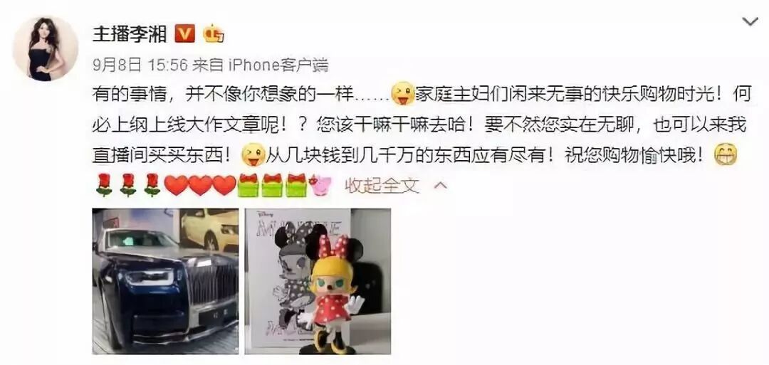 而李湘自从直播卖货以来,有不少人质疑她“是不是缺钱了”,认为她从女主持到女主播是在自降水准。李湘前天则晒出家里豪车霸气回应争议,称“家庭主妇们闲来无事的快乐购物时光!何必上纲上线大作文章呢!?您该干嘛干嘛去哈!”