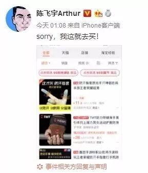 今天凌晨,陈飞宇发文回应此事,“sorry,我这就去买”,还配了搜索防手滑的商品页面截图,盖章此次点赞行为纯属手滑。