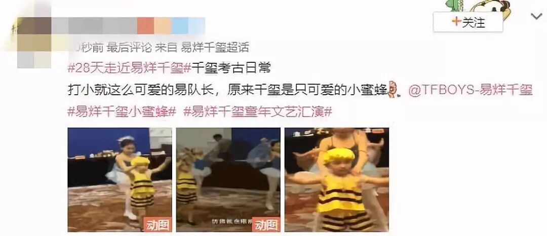 近日,有网友晒出易烊千玺幼年参加文艺汇演时的照片。只见小千玺身穿黄色小蜜蜂的表演服装,跟着音乐与大家一起跳舞,软乎乎地十分认真。