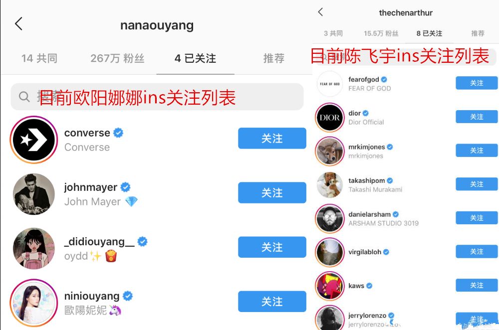 今天,有网友发现欧阳娜娜、陈飞宇ins互相取关,但微博仍然互关。