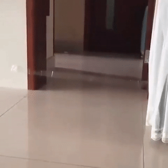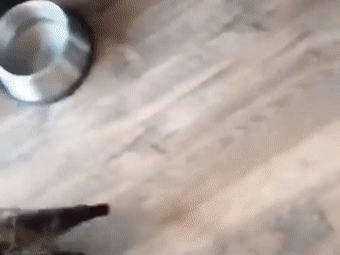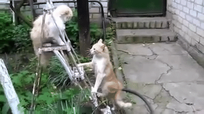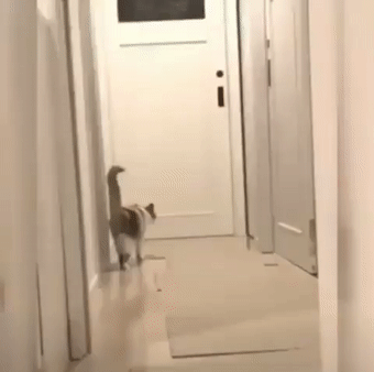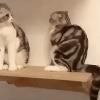 还有下面这两只猫,一只正在家中散步,而另一只猫从背后偷袭过来,散步猫立马来了个反扑,这个反应真的神了: