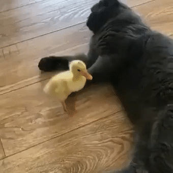 一只小鸭子走到了猫咪的领地,猫咪也十分不客气一脚踹飞,好像在说:不要打扰我睡觉,此路不通。