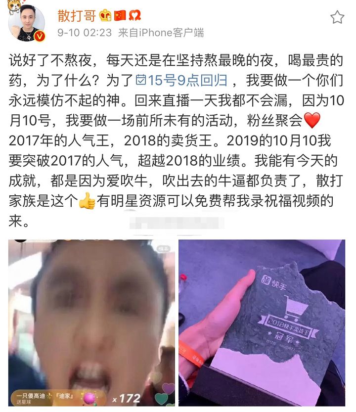 散打发文喊话我要做一个你们永远模仿不起的神,回来直播一天我都不会漏,因为10月10号我要做一场前所未有的活动,粉丝聚会2017年的人气王,2018的卖货王,2019的10月10我要突破2017的人气,超越2018的业绩。我能有今天的成就,都是因为爱吹牛,吹出去的牛逼都负责了,散打家族就是牛,有明星资源可以免费帮我录祝福视频的来。