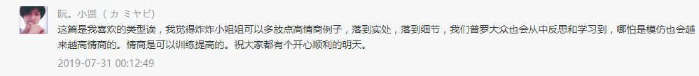 这篇是我喜欢的类型诶,我觉得炸炸小姐姐可以多放点高情商例子,落到实处,落到细节,我们普罗大众也会从中反思和学习到,哪怕是模仿也会越来越高情商的。情商是可以训练提高的。