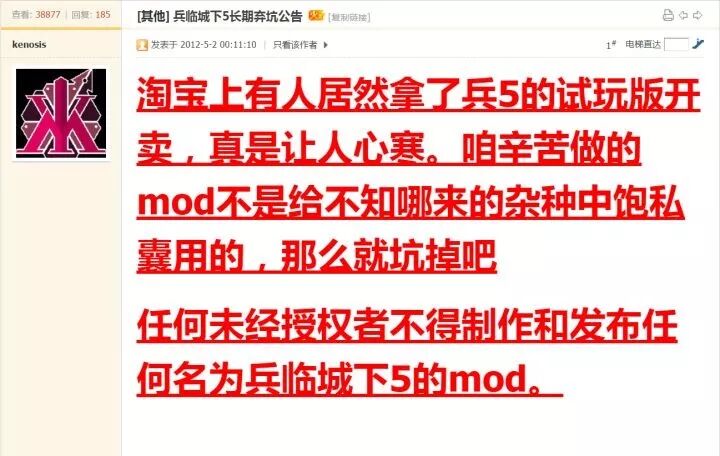 几年后当原作者“不吐皮”准备制作《兵临城下5》时,试玩版却被淘宝商家拿去上架,此举让作者决定彻底弃坑,直到去年作者才在红警DIY论坛上宣布重启。