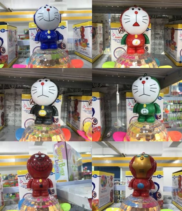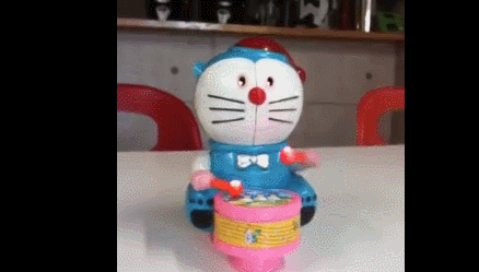 当你打开开关,它就开始打鼓,同时眼睛还放出两道诡异的红光,敲着敲着,“哆啦A梦“的脸会冷不丁地从中间裂成两半张开,然后伸出一只象鼻子来。