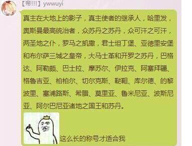 他自诩是真主在大地上的影子,真主使者的继承人,哈里发……(省略几十字)……爽哥。