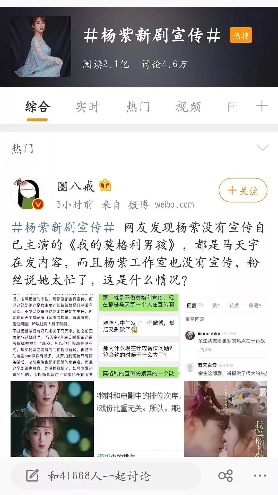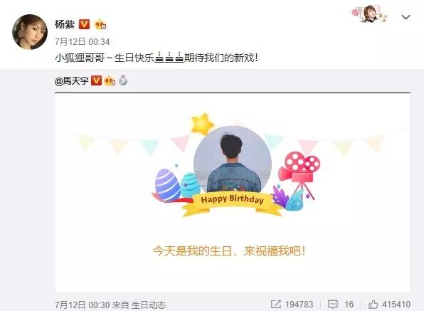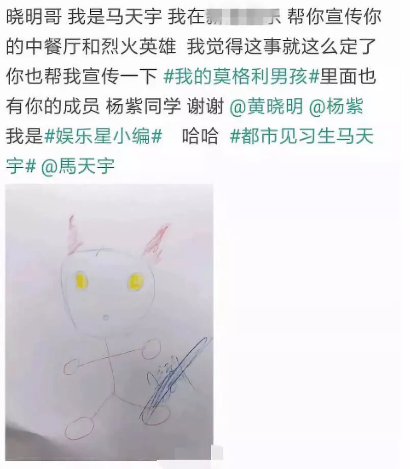 后来马天宇发了一条微博说明自己宣传新剧有多努力,开了好多先例。通过这条微博,大家揣测他是在内涵杨紫不宣传。