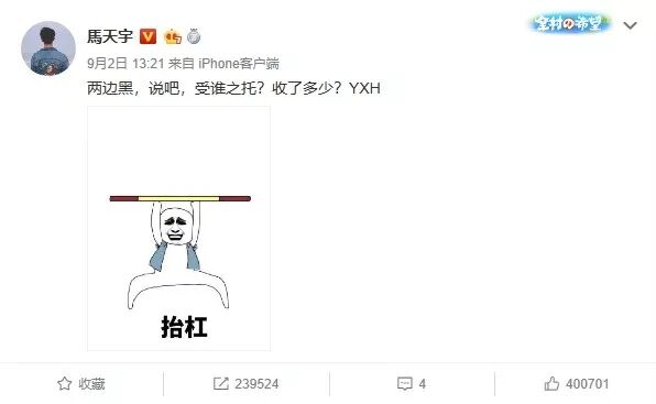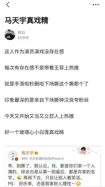 第二天,马天宇又发文怼营销号“两边黑”,似是为杨紫鸣不平,但又让人觉得这还是在耍心机。因为两位演员被网友揣测,就是由于马天宇发微博有歧义,其次营销号并没有说什么,大部分还是两家粉丝在掐架。