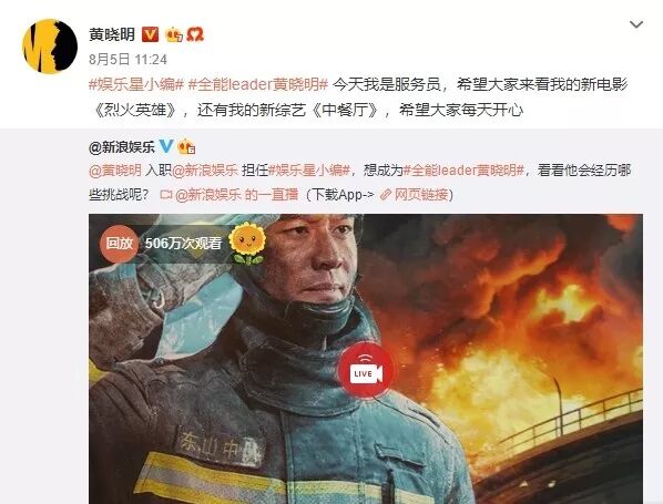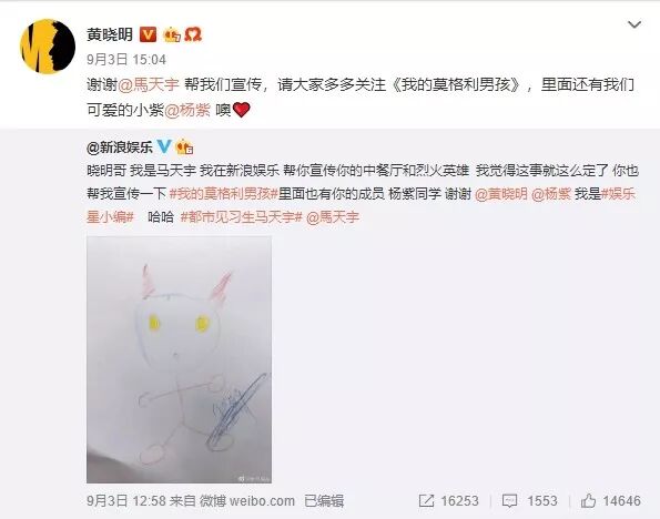 这件事还没过去,前两天马天宇又去某平台扫楼宣传新剧,他用该平台账号发了一条微博,对黄晓明喊话并直接@了另一位主演杨紫,好似在提醒杨紫也是剧的主演,可她并没有宣传。