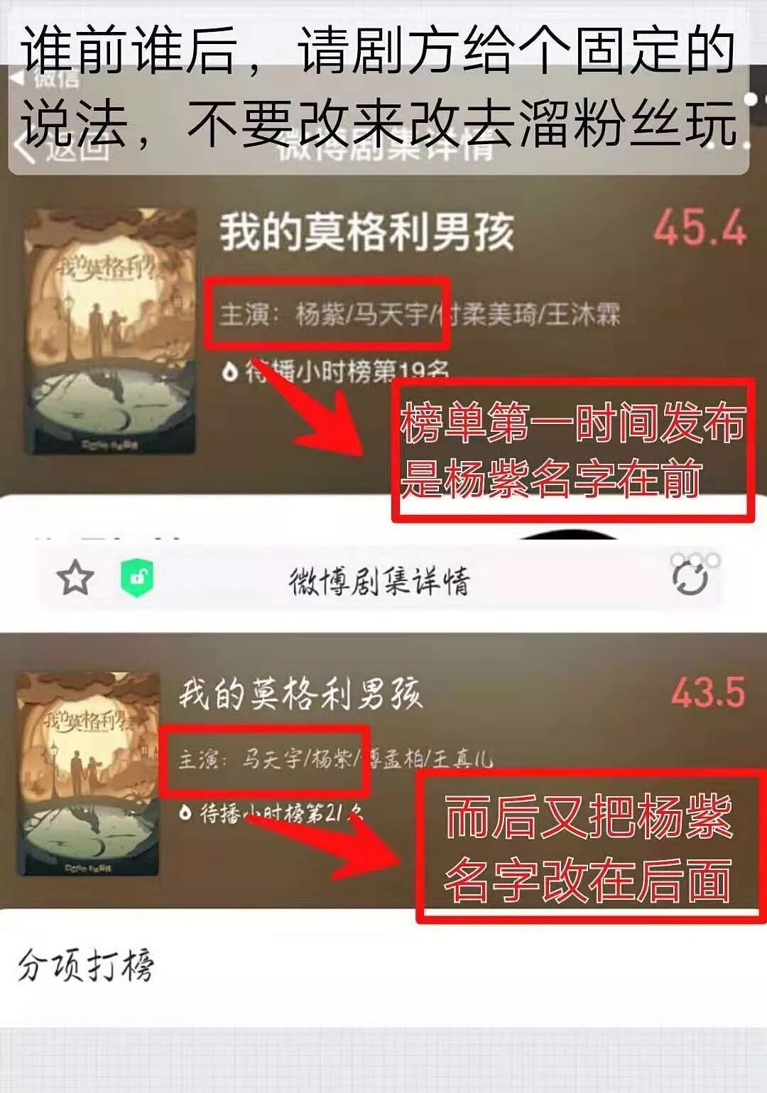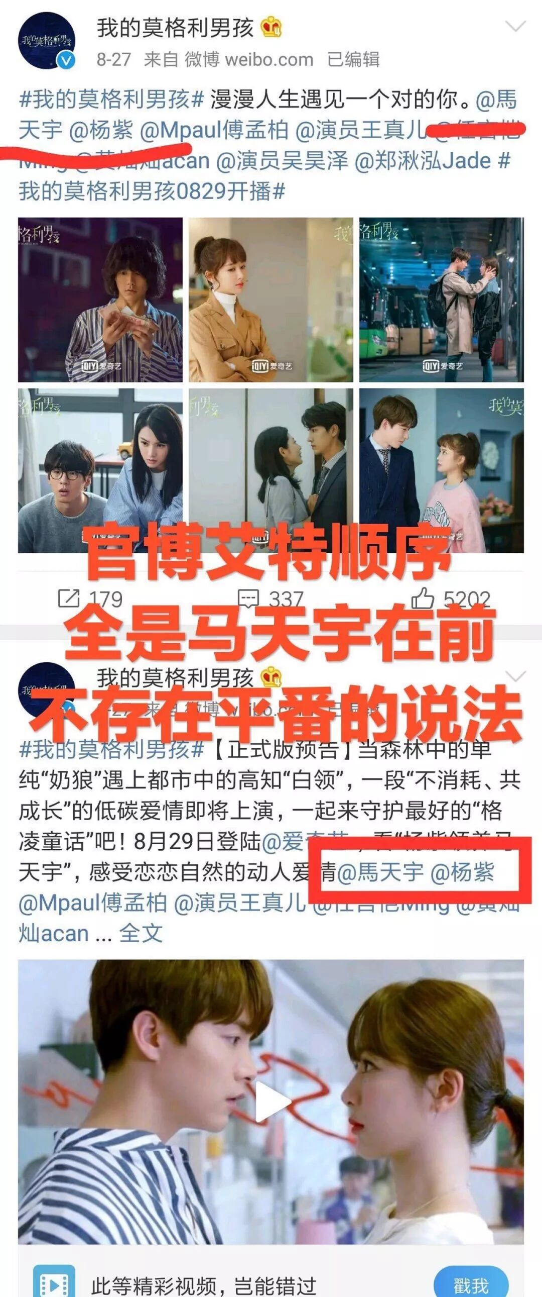 有网友给出证据,比如官博的关注顺序和官博@顺序都是马天宇在杨紫前面。