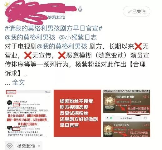 还有一种说法是《我的莫格利男孩》这部剧去年就拍了,被压好久宣发都是另外组的团队,中途一点物料都没有放出来,是赶着杨紫热播剧水花临时就上来了,29日开播,23日才有官微。剧方都这么不专业、混乱,就别要求演员了。