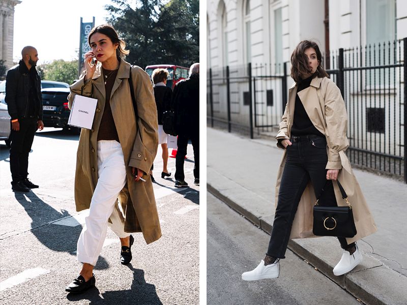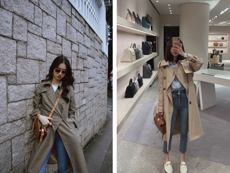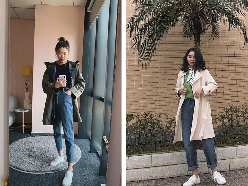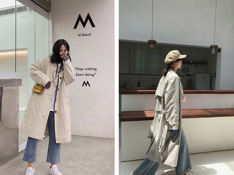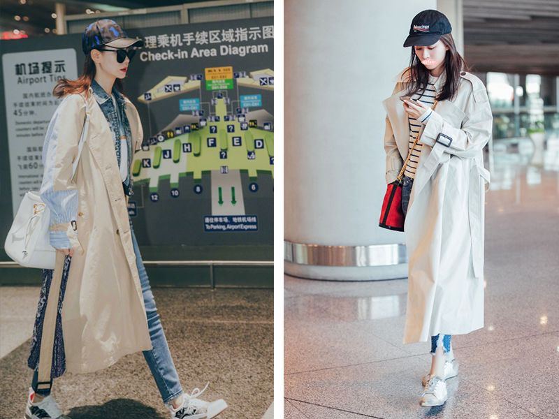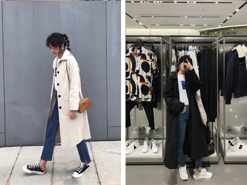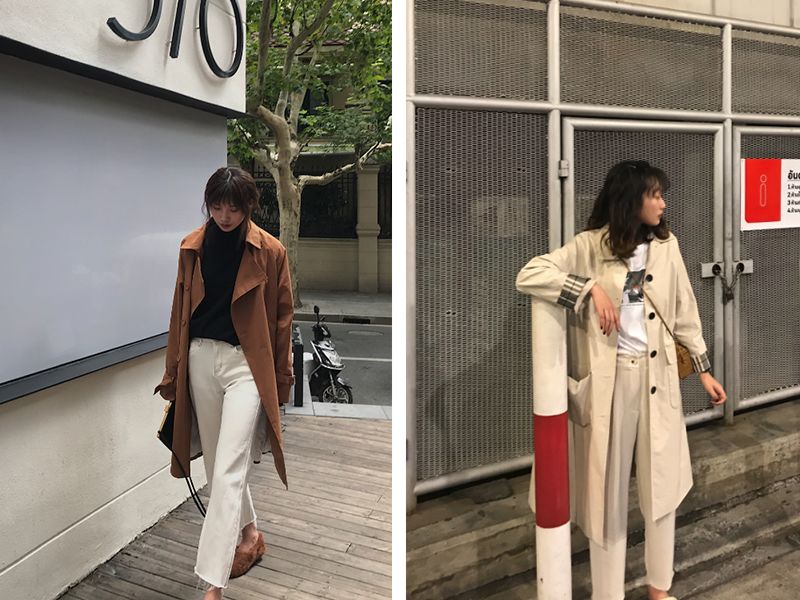 不管是浅色或深色的风衣,搭配牛仔裤都是不错的选择,黑白蓝三色很经典了。