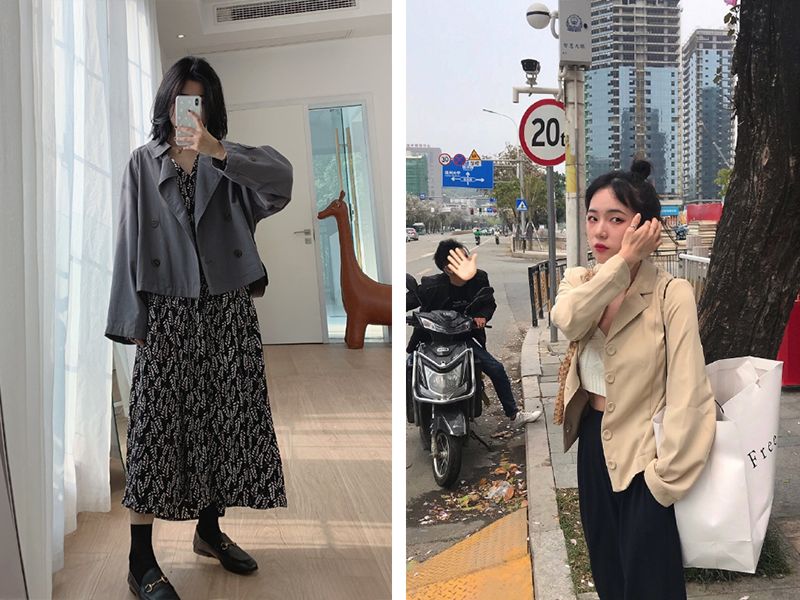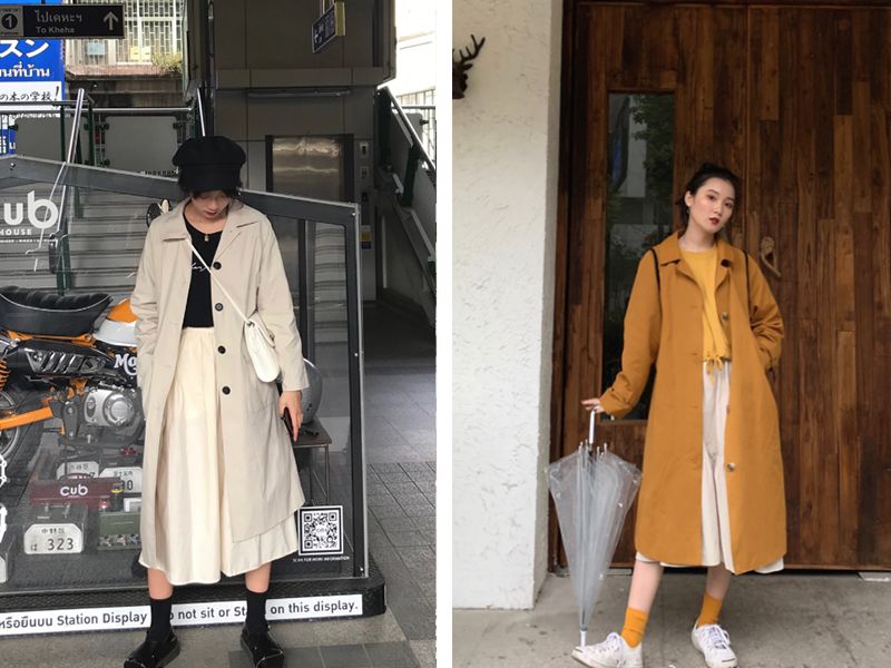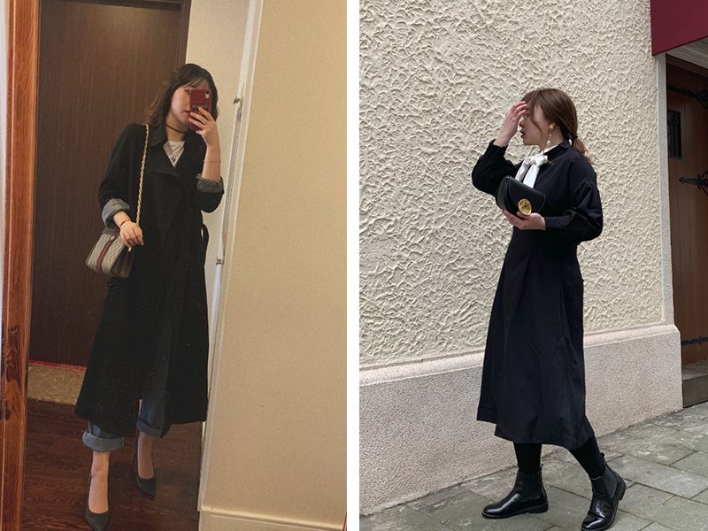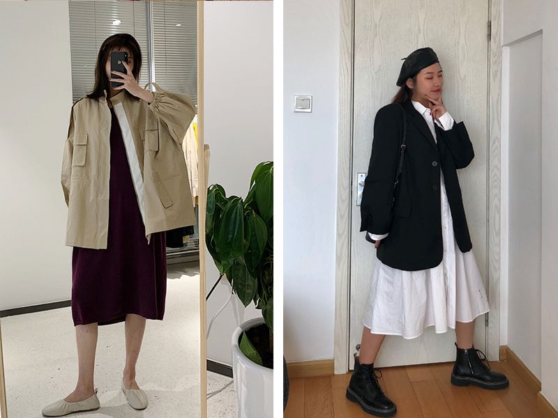 没有收腰的连衣裙,搭上中长款的风衣外套,可以制造层次感,会有叠穿效果。