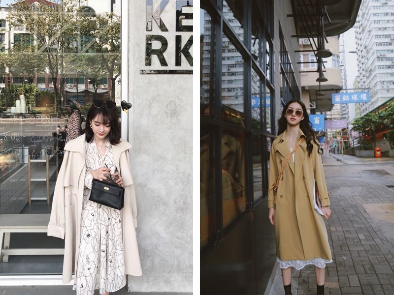 风衣与连衣裙搭配是近两年的流行,非常优雅的女人味穿搭,推荐内搭简约些。