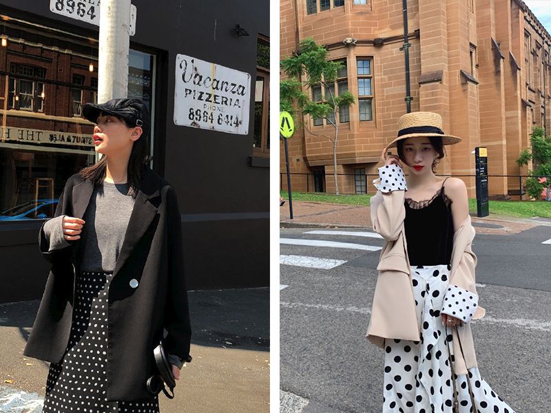 小个子仙女,鸭梨推荐这种中长款的,在膝上10cm左右,搭配波点半裙美极了。