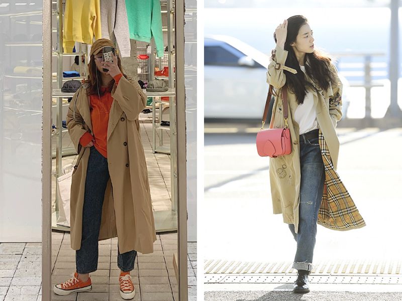 戚薇、乔欣的这款风衣,版型宽松,米色内搭牛仔很有气质。