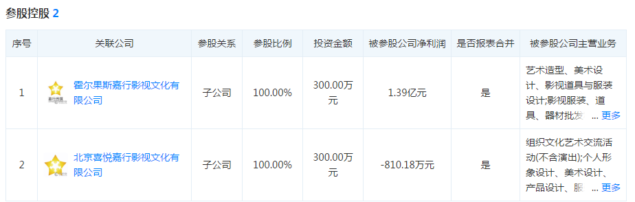 这个被投资的西安嘉行传媒名下,又拥有霍尔果斯嘉行、北京喜悦嘉行等等多家全资子公司。