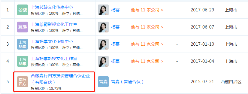 只要稍微查一下就能发现,杨幂名下的11家公司里,有一个2015年成立的,西藏嘉行四方投资管理合伙企业。