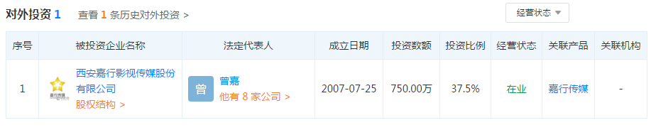 而以这家公司的名义,投资了西安嘉行传媒,投资的占股比例将近40%