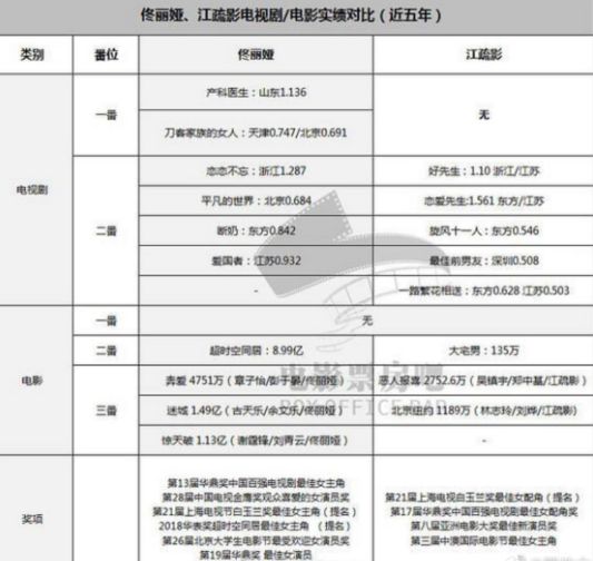 还列出了江疏影和佟丽娅电影电视剧的实绩,进行对比。