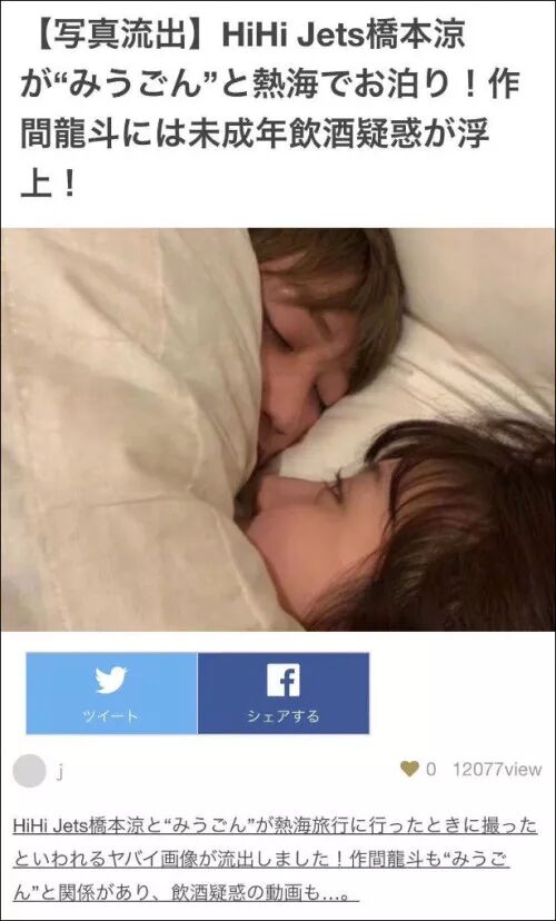 见杰尼斯方面一直退让,于是得寸进尺,在9月2日晚将桥本凉的床照和作间龙斗的醉酒照正式曝光。
