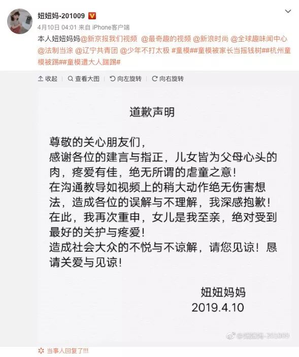 也许是怕事情闹大,也许是怕这段视频会影响订单量,妞妞妈妈不得不发微博道歉,但是道歉中不但没有感受到一丝歉意反而在给自己洗白。