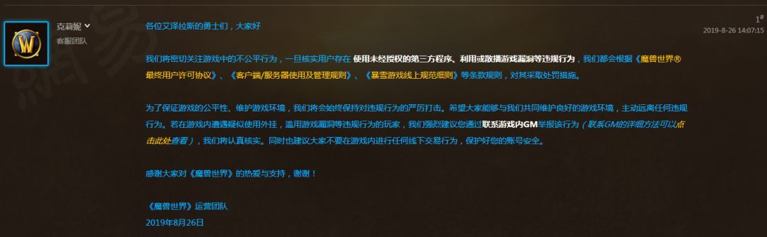 网易官网论坛则是在上午出台了公告,表示“部分玩家在参与团队副本活动时遇到了欺诈行为,如未按事先约定分配装备等,所以提醒广大玩家朋友们,在参与团队副本活动前务必在游戏中与团长确认好分配模式,如您不幸受骗,也请在游戏中保存好相关信息,并向游戏内GM进行举报 ,工作人员会根据查证结果采取收回相关游戏虚拟物品、暂时甚至永久冻结账号等处理措施”。