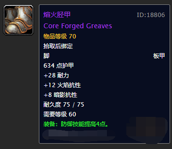 打完老九,又出了一个熔火胫甲,这是一个火焰抗性的鞋子,在WOW的第一个版本火属性BOSS较多的环境下,一般是作为坦克的装备的,或者DKP竞拍也可以。