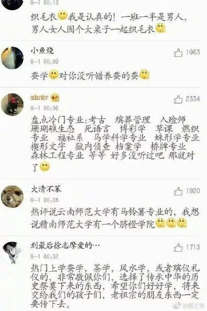 你自己滑动看看👇,殡葬礼仪与管理专业就算了,养蚕学、风水学、葡萄干晾晒专业、母猪的产后护理这些都是什么啊?(感觉开明的父母也不会让填报的)