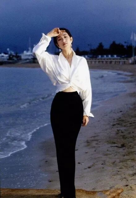 1993年和哥哥一起的合影大概是无数人心中的白月光了吧。这一场只是简简单单的白衬衫搭上深色长款包裙,但举手投足之间还是美到窒息。