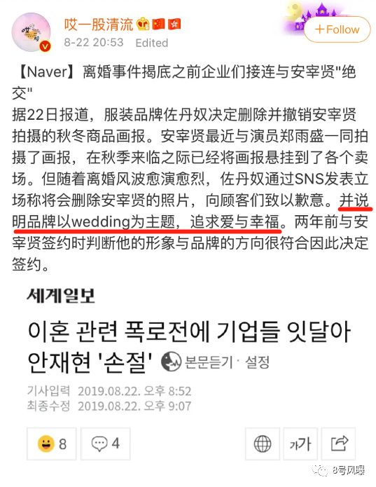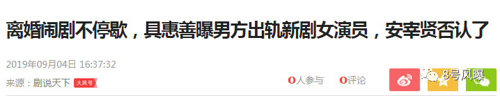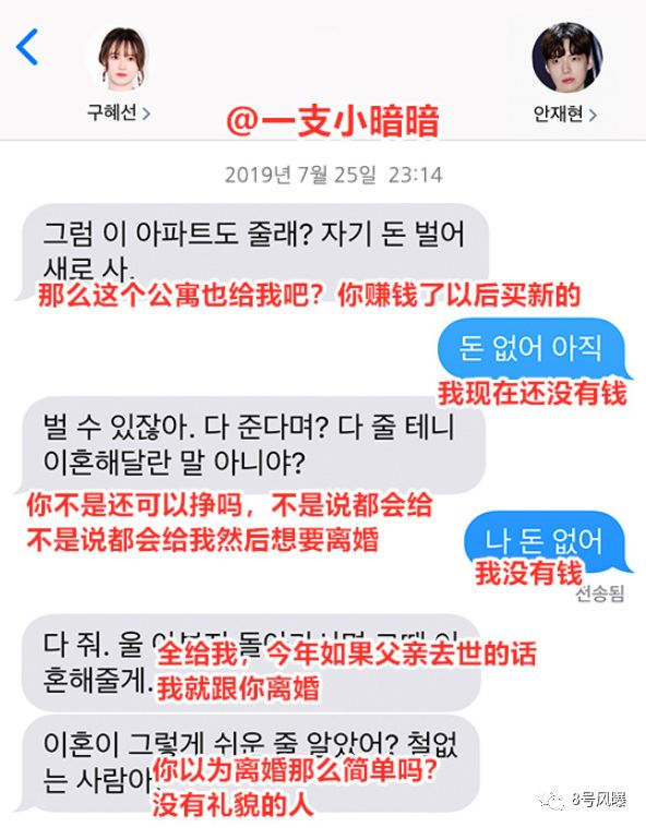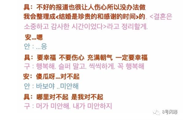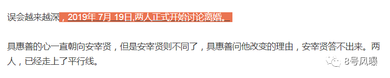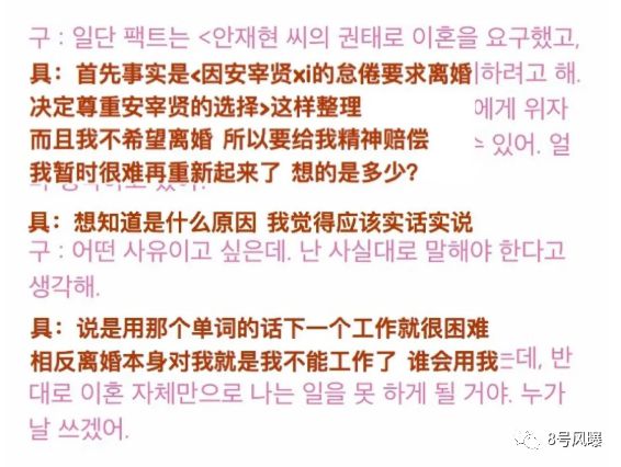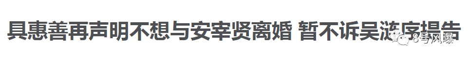 - 8号风曝 有趣/有撩/有聊/有料 新的一天,新的窒息…… 具惠善安宰贤的离婚大战已经升级,夫妻俩的人设和口碑一下子倒了过来: 本来女方是温柔姐姐,金句拈手就来,“他好像只是短暂地爱了我一下”字