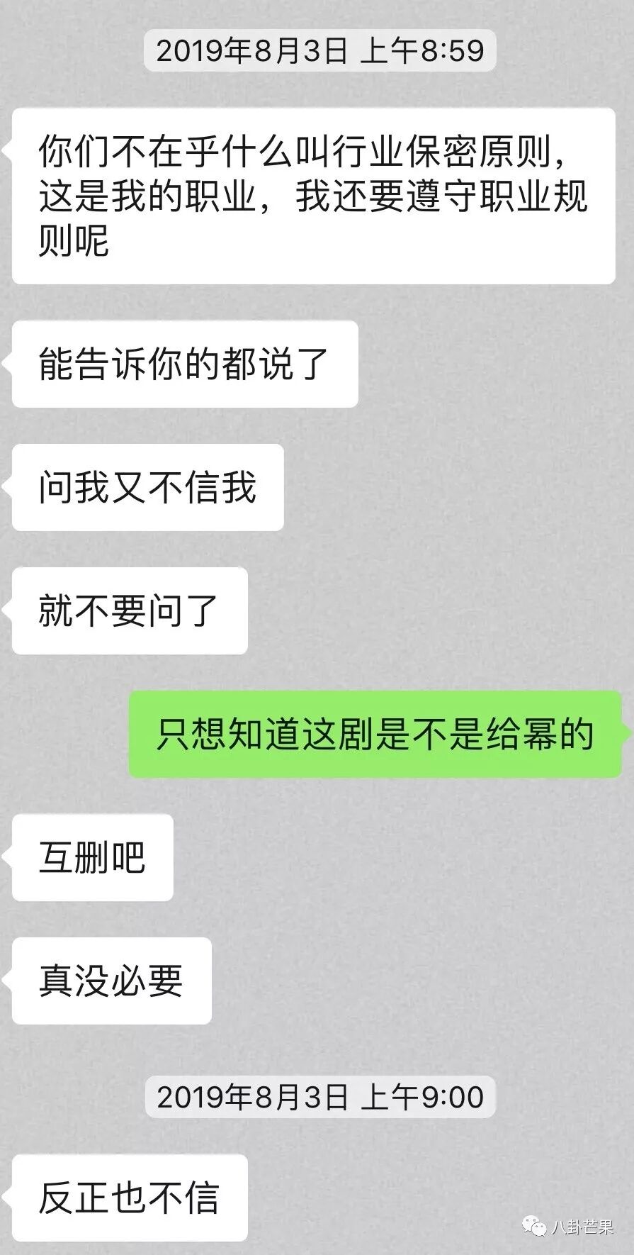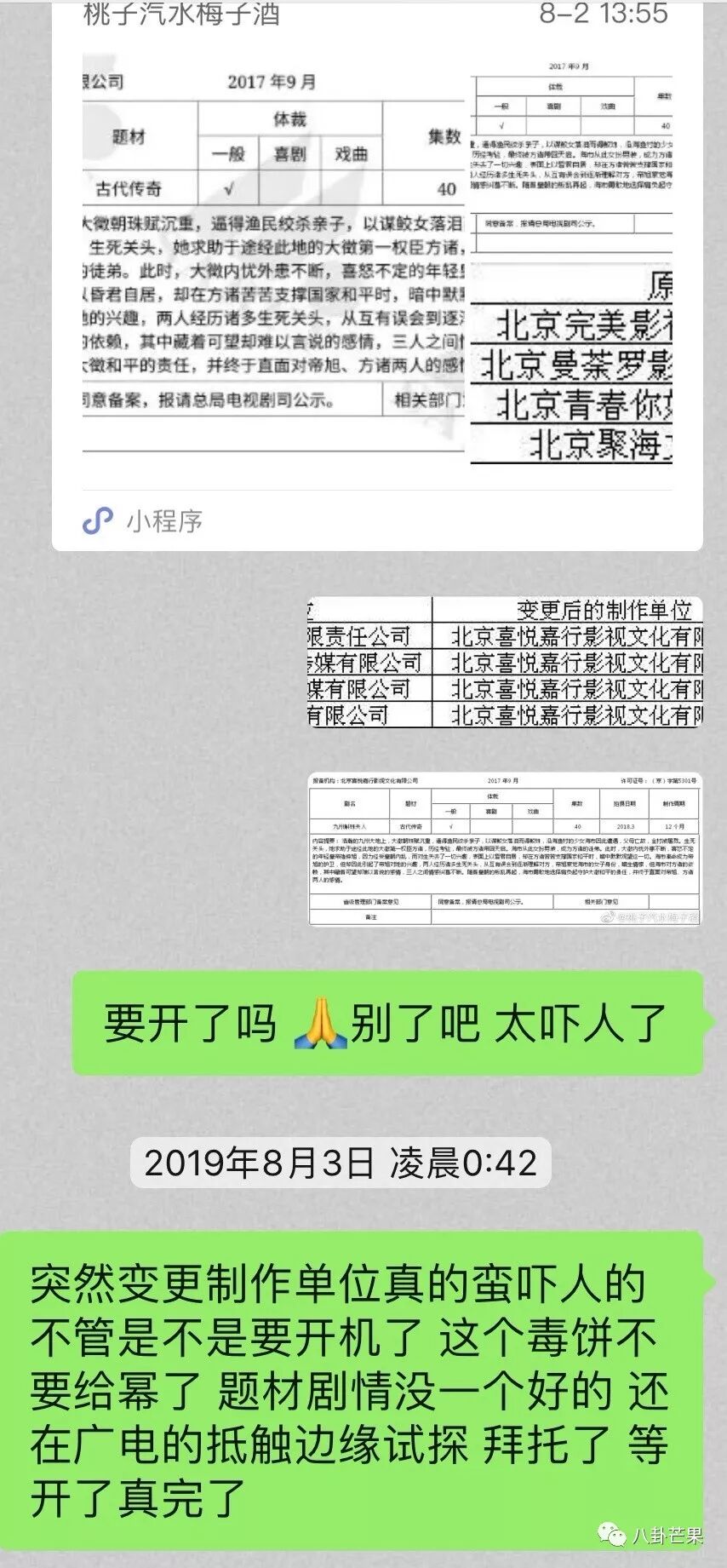又过了一段时间,这位大粉看见新剧的制作方全部改成了嘉行。更慌了,又找嘉行的覃西求证,这不就是当着人家的面骂人家公司的意思吗?