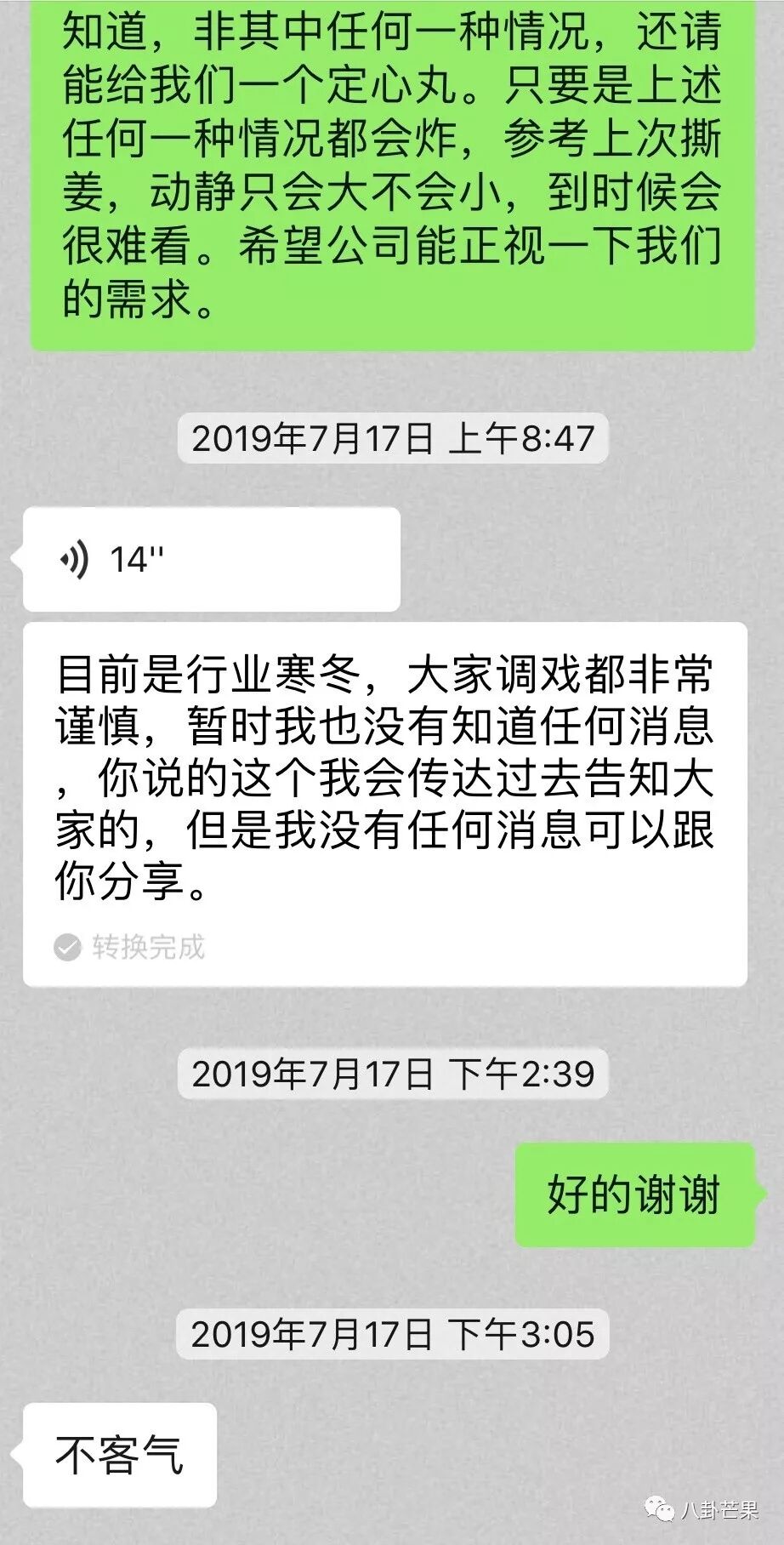 在对话里,大粉求证接戏的问题,甚至有点“威胁要撕”的意味。覃西用“影视寒冬”来对付。