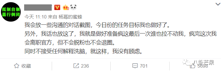 杨幂的一个大粉,代表其他粉丝跟公司沟通对新剧的不满,没有得到理想的回应,怒而辞职并决定开撕。(是的,有的大粉是职业的,简称职粉。)