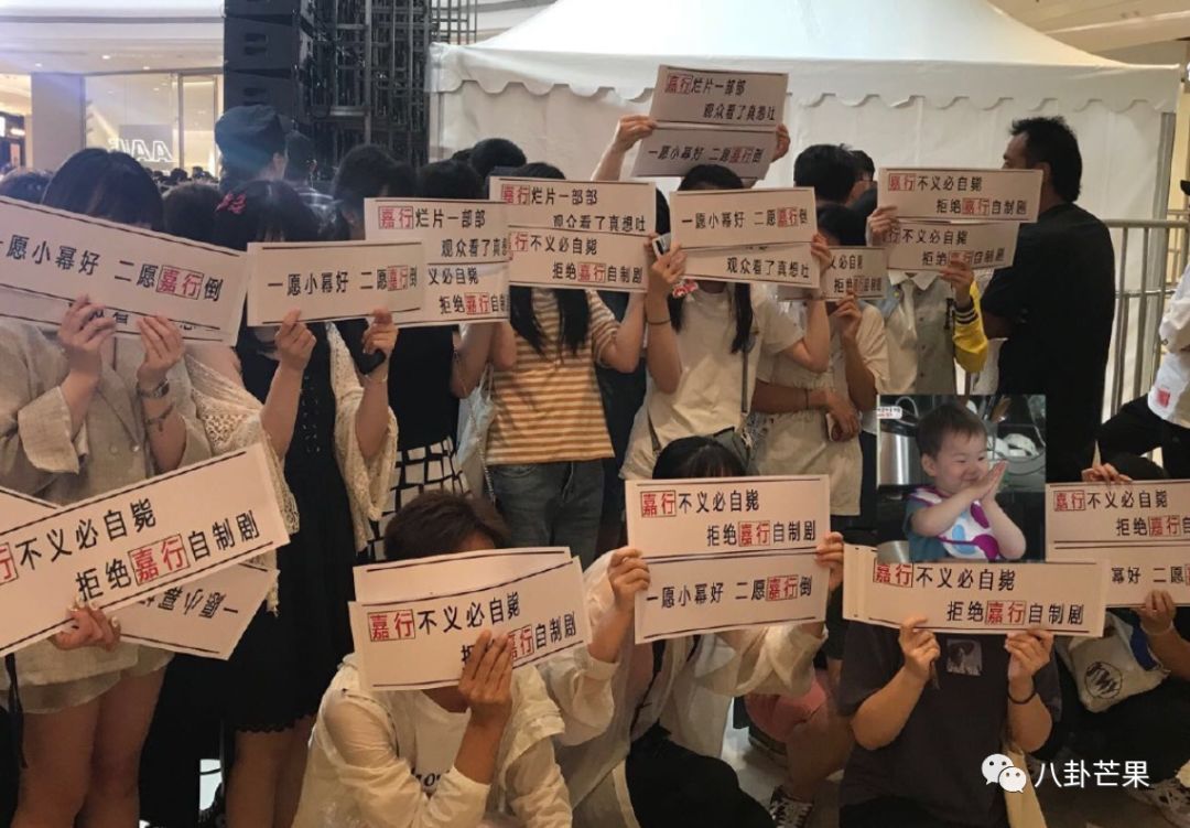 这些不是黑粉,是真爱粉,她们不但举横幅,还大喊口号“要做好演员,拒绝嘉行剧”!可以想象杨幂当时多么尴尬,黑粉都做不到的事,自家粉丝做到了!