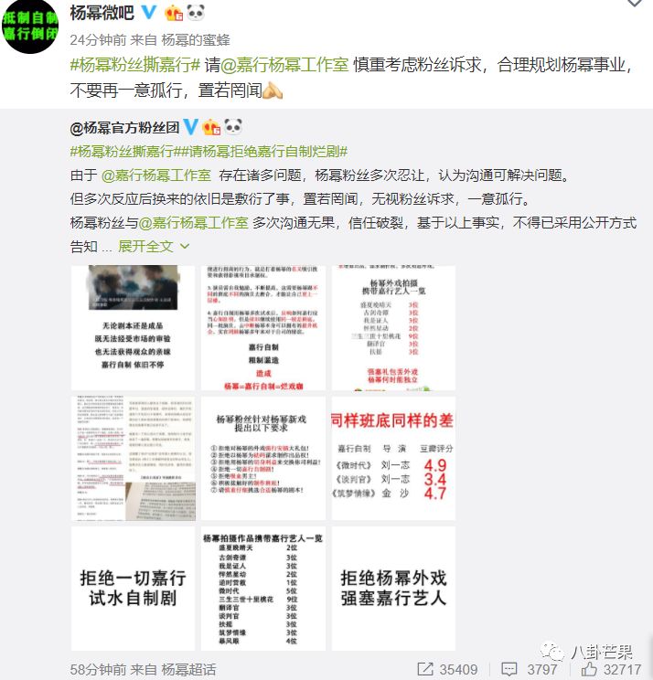 粉丝第二天就集中火力撕了,就连顶着蓝V的“杨幂微吧”“杨幂官方粉丝团”也下场了,大家齐刷刷换上了“抵制自制,嘉行倒闭”的头像。但是,嘉行和杨幂的利益深度捆绑,粉丝喊着倒闭是要气死谁......