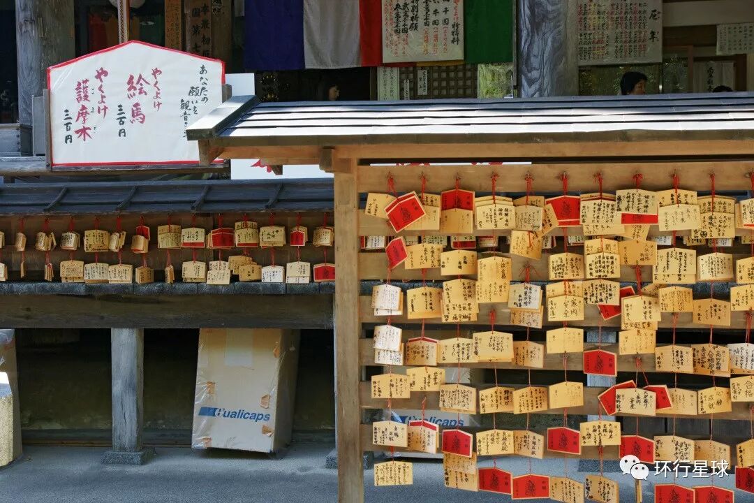 去神社许愿时,可以购买一块“绘马”,一般是一块五边形的木块,在上面写上愿望并悬挂在指定位置,每年春季制定的日子,神社的工作人员会统一烧掉这些绘马,象征愿望已被送达。