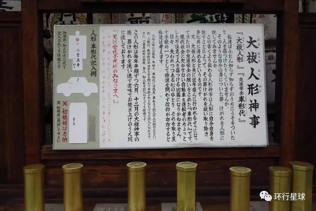 还有一种“人形代”,是把纸剪成人的样子,参拜者在纸上写上自己的名字和年纪,然后将纸片留在神社,每年春季三月三日,神社会举办法事把这些“代”烧掉,灰烬倒入河水中,象征着参拜者的罪孽和霉运都一笔勾销了。