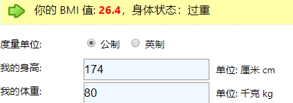 他身高174,体重80kg,BMI(身体质量指数)指数显示在过重的区间,属于中年男性的正常身材。
