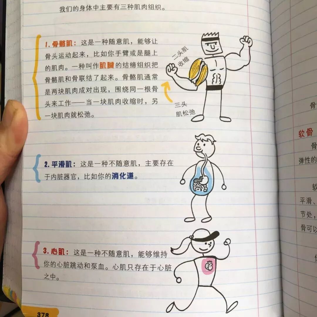 不仅有数学,娃看到人体肌肉组织这一页很兴奋,说终于知道“平滑肌”是哪些地方了,进而知道人体的三种肌肉组织和它们的分布,文字配图画不能更直观了。