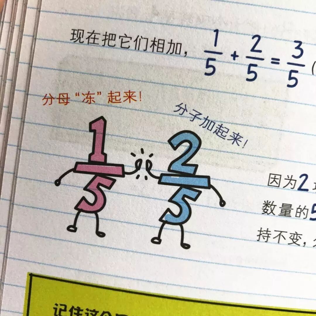 娃看到分母“冻”起来,画面感十足,一下子就理解了,之后做同分母加减再也没不会把分母也想加了。