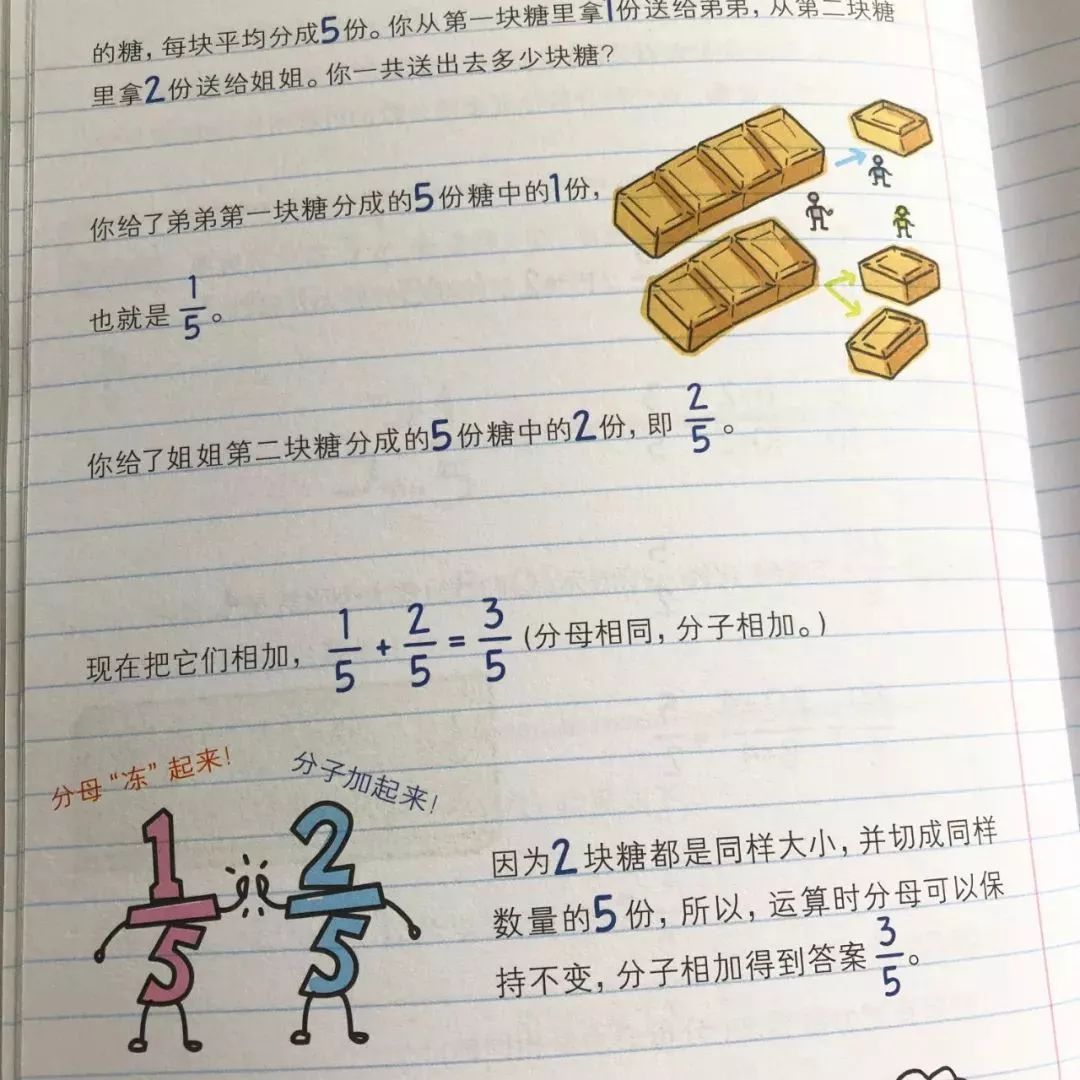 比如最近学习到分数加法了,娃会把分子相加,同!时!分母也相加~纠正过多次,万恶的小手总是要去加一下分母,这是学渣的脑回路无疑了。豆妈找来这张图给娃看,娃秒懂啊!
