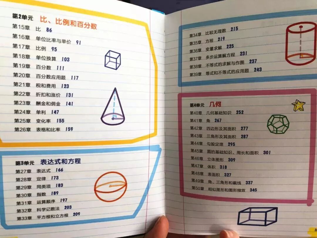 基本涵盖了小学到初中的所有数学知识,前面三个单元(数的系统,比、比例和百分数,表达式和公式)是小学的数学知识,后面三个单元(几何、统计和概率、平面直角坐标系与函数)是初中的数学知识。