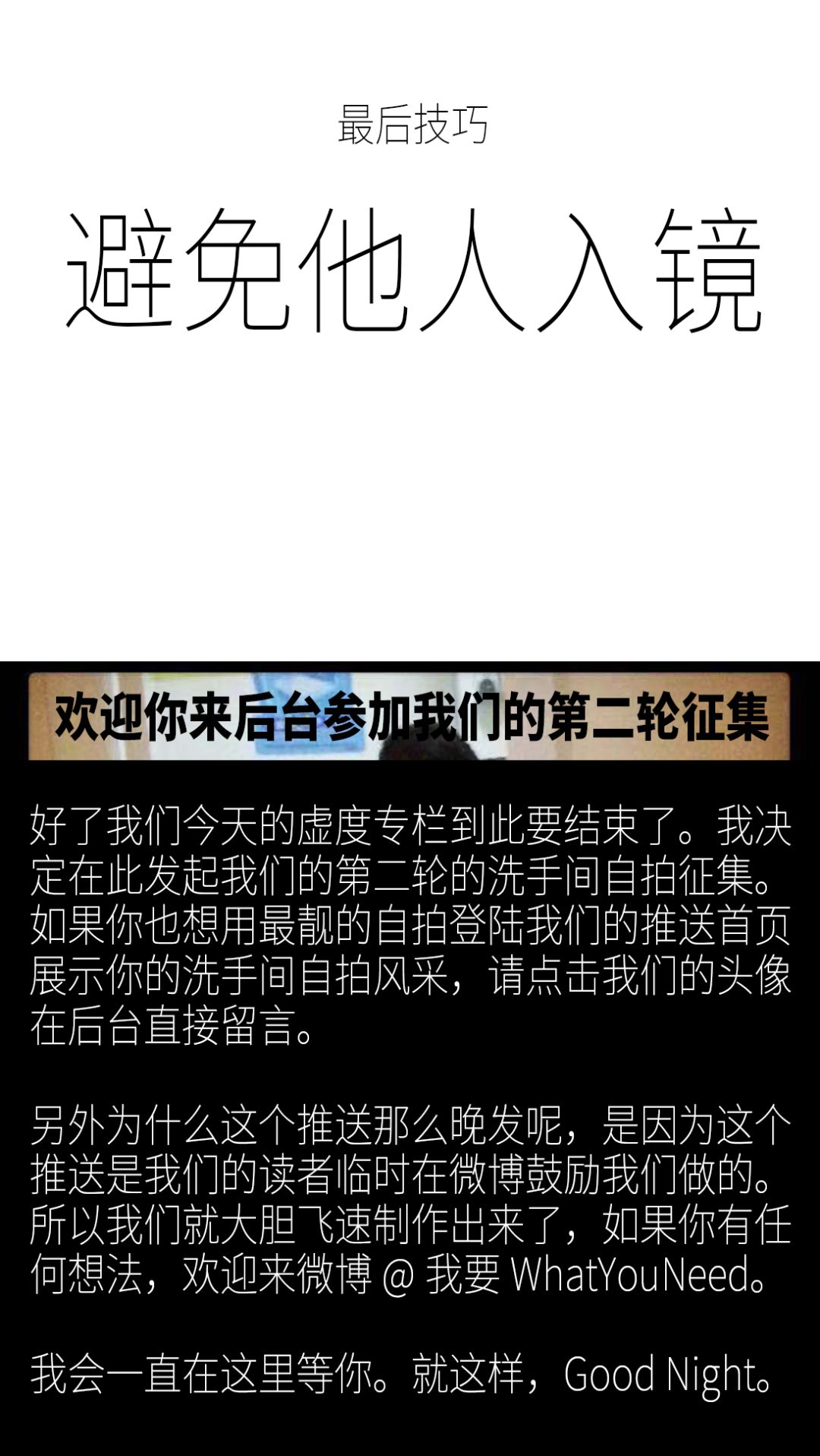 - 大家好,欢迎回来 WhatYouNeed,很高兴在今天的深夜与你相遇,我们将会认真和你聊聊,在当代年轻人所喜欢的厕所自拍里,最重要的技巧是什么。他们又是如何在洗手间里,通过自拍获得朋友圈胜利的。请看: