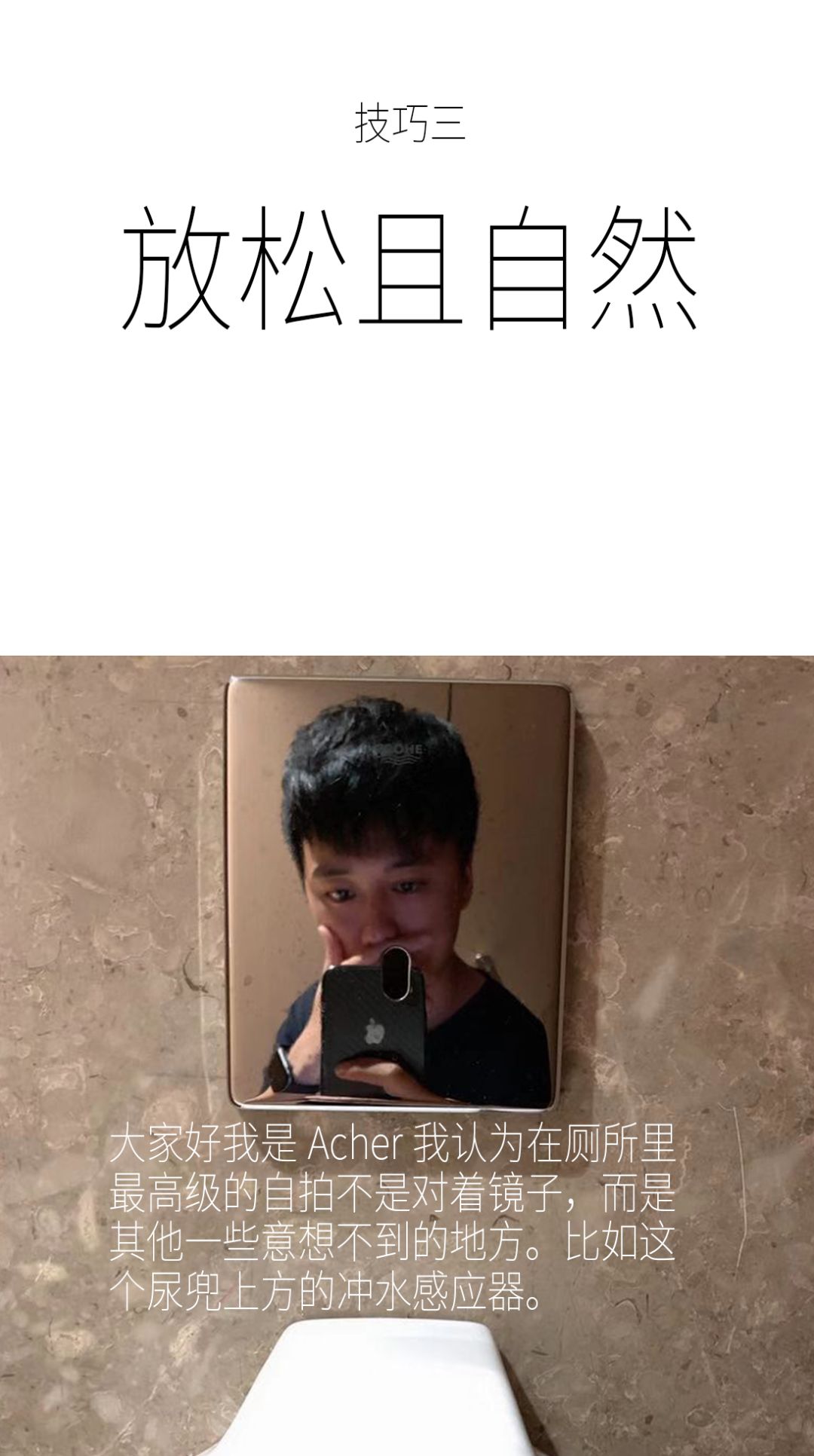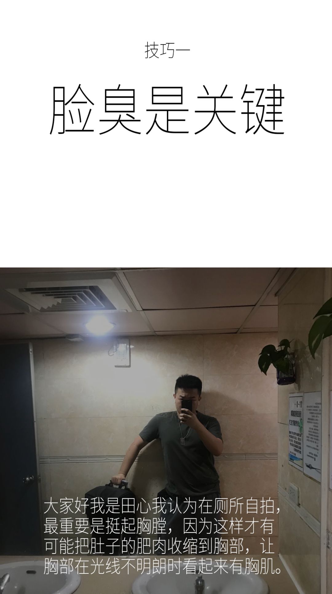 大家好,欢迎回来 WhatYouNeed,很高兴在今天的深夜与你相遇,我们将会认真和你聊聊,在当代年轻人所喜欢的厕所自拍里,最重要的技巧是什么。他们又是如何在洗手间里,通过自拍获得朋友圈胜利的。请看: