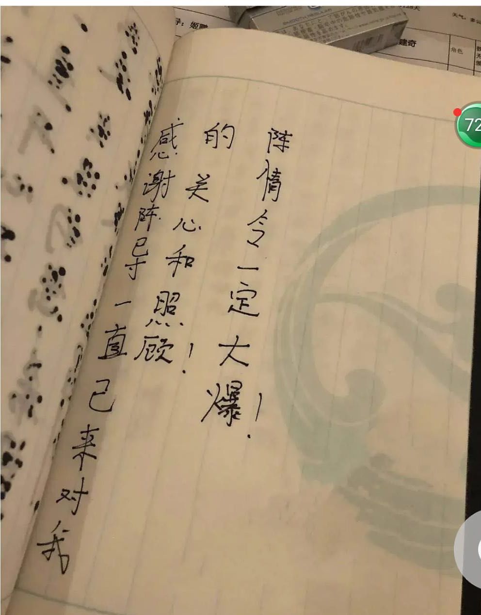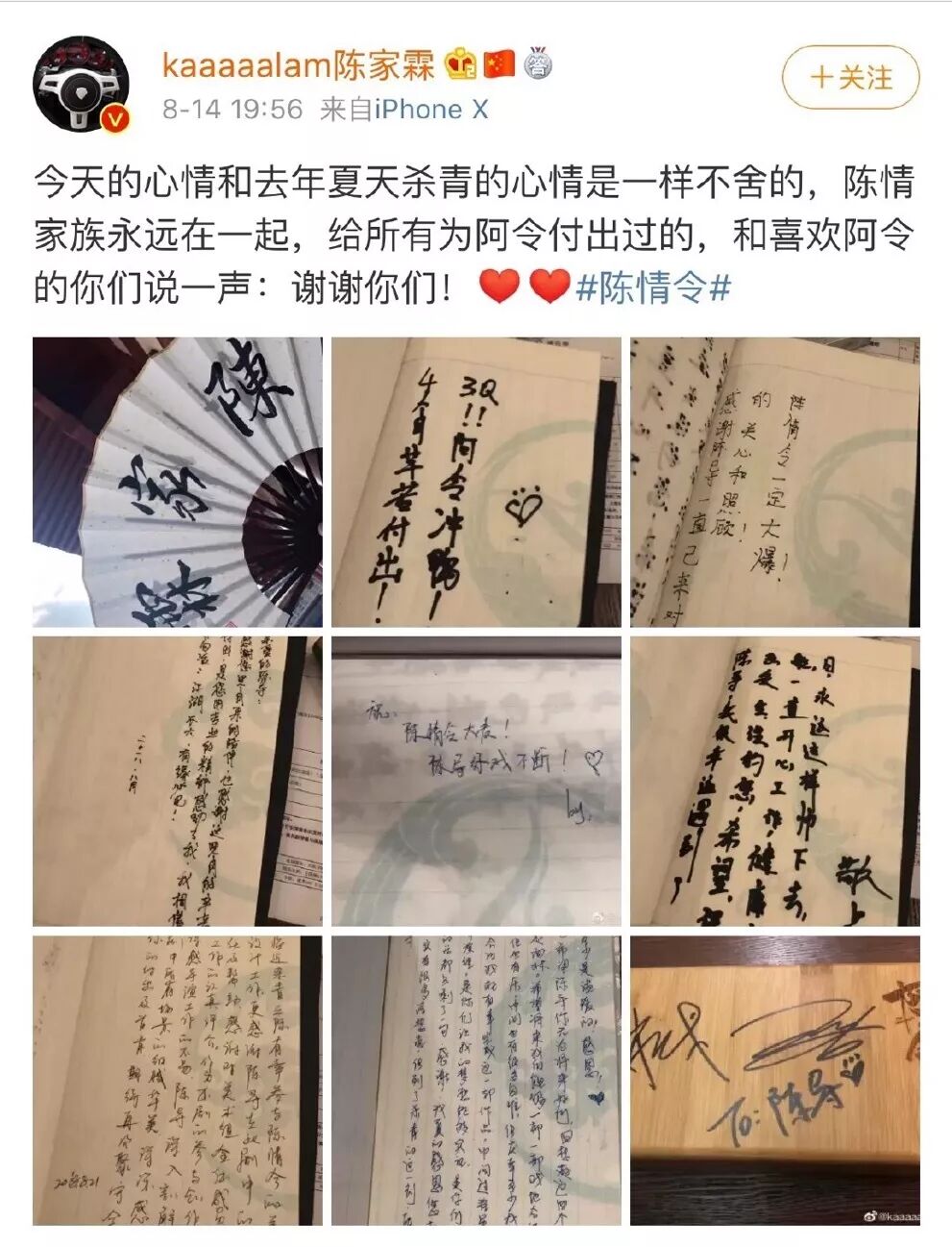 虽然陈家霖在微博里没有明确点出到底哪一张是哪一位写的,但明眼人都知道,两位主演肖战和王一博因为《陈情令》的播出而大火特火,而且也都是一二番,因而推断出导演晒的九宫格中前两张是肖战王一博的亲笔。