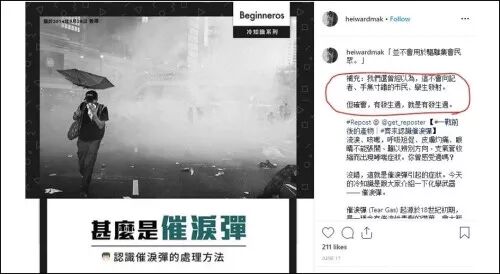其中,像是在2014年所谓的“占中”运动发生期间,麦曦茵在个人ins账号“Heiward Mak”上发文科普催泪弹及遭受催泪弹攻击后的清理方法。她表示,“‘并不会勇于驱离集会民众’,补充:我们还曾经以为,这不会向记者、手无寸铁的市民、学生发射。”