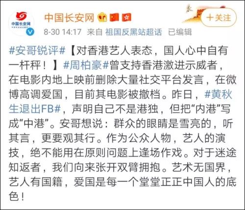 对此,中央政法委新闻网站@中国长安网 发表观点指出,对香港艺人表态,国人心中自有一杆秤。