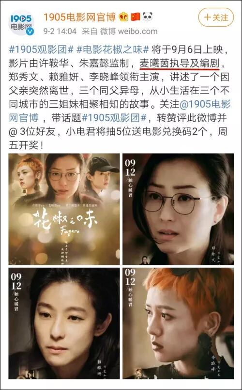 我们也注意到,在被网友起底导演涉嫌“港独”后,《花椒之味》的宣传中只提到了几位主演的名字,唯独不提麦曦茵的名字,似乎在有意回避麦曦茵的相关因素。截止目前,片方仍未有所正面回应发生在导演麦曦茵身上的争议言行。